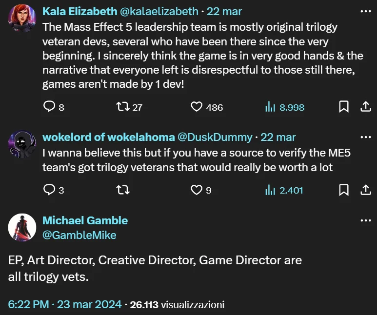 Ciononostante, nelle ultime ore sono giunte alcune informazioni in merito alla lavorazione del nuovo capitolo della saga, che annovererebbe tra le proprie file molti veterani della trilogia originale. Tale aggiornamento è giunto direttamente dal game director Mike Gamble, che ha voluto esternare come coloro che hanno reso celebre il franchise del capitano Shepard siano ancora al lavoro sulla fortunata IP.
