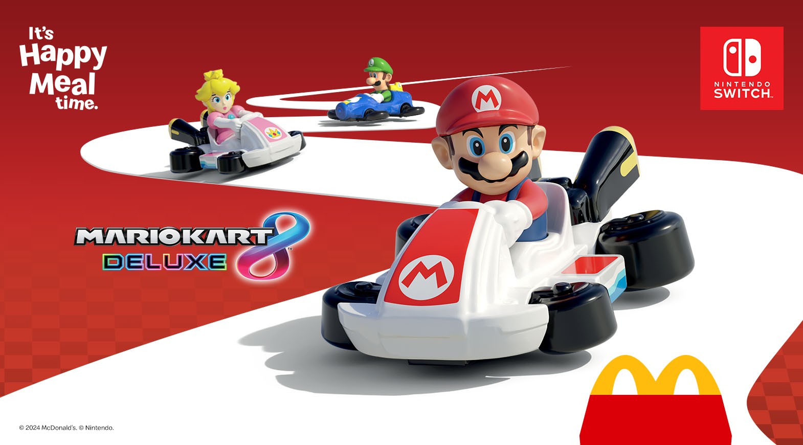 Mangiando da McDonald’s e ordinando un Happy Meal, potrete così avere l’opportunità di trovare uno tra Mario, Luigi, Toad, Donkey Kong, Peach e Toadette a bordo dei loro caratteristici kart. A questi si uniscono anche le speciali varianti Gold Mario e Peach Rose Gold.