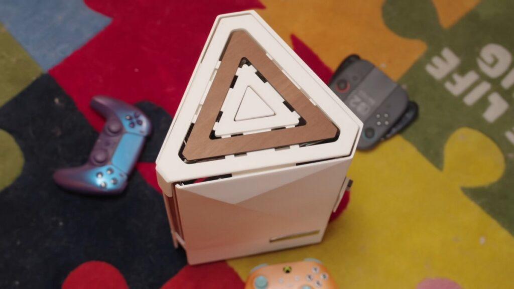 La modder e YouTuber cinese 小宁子 XNZ ha costruito il sistema all-in-one utilizzando il design cilindrico del Mac Pro di Apple. Lo ha adattato in un layout triangolare, con ogni lato dedicato a una console in particolare. Le schede madri sono state smontate e montate su un lato ciascuna.