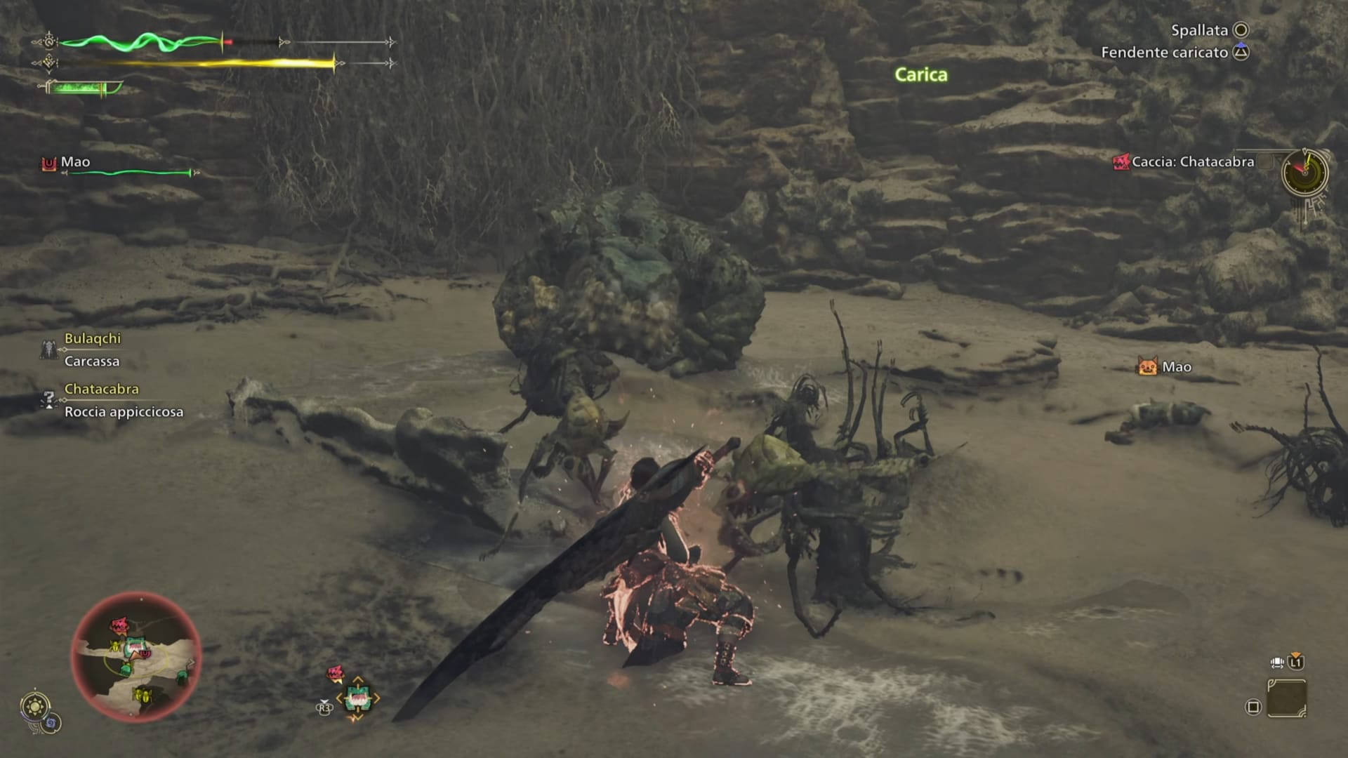 Proseguendo il combattimento, noteremo che il Chatacabra andrà periodicamente a ricoprirsi gli avambracci di pietra per proteggerli e potenziare i suoi attacchi in mischia. Tuttavia, puoi rompere facilmente lo strato di pietra che li ricopre con continui attacchi mirati, riducendo così la sua capacità offensiva.