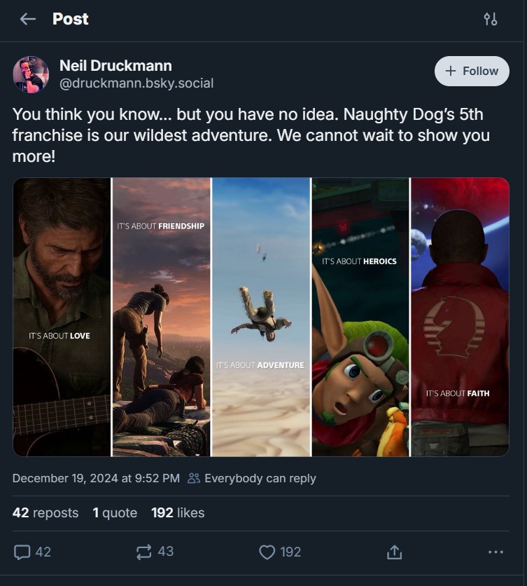 La presentazione della nuova IP di Naughty Dog, Intergalactic: The Heretic Prophet, non ha ricevuto l’entusiasmo che il team dei cagnacci si aspettava, questo è fuori dubbio. Tuttavia, Neil Druckmann ha deciso nelle ultime ore di scendere direttamente in campo per difendere il titolo, dichiarando che questa rappresenta l’avventura più audace dello studio.