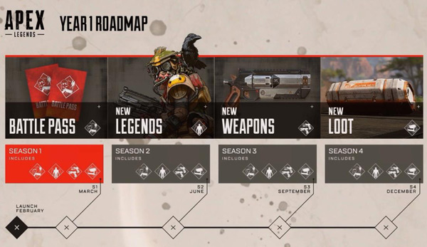 Come potete vedere dall’immagine sottostante, la Stagione 1 di Apex Legends avrà inizio a marzo, per concludersi poi a giugno quando aprirà i battenti la seconda stagione di gioco. In occasione della Stagione 1, così come per tutti i futuri eventi, saranno date nuove armi, nuovo loot, nuove Leggende e contenuti per i Battle Pass. Il prezzo del Battle Pass non è ancora stato annunciato, ma gli sviluppatori hanno confermato che questo darà l’accesso ai soli oggetti cosmetici.