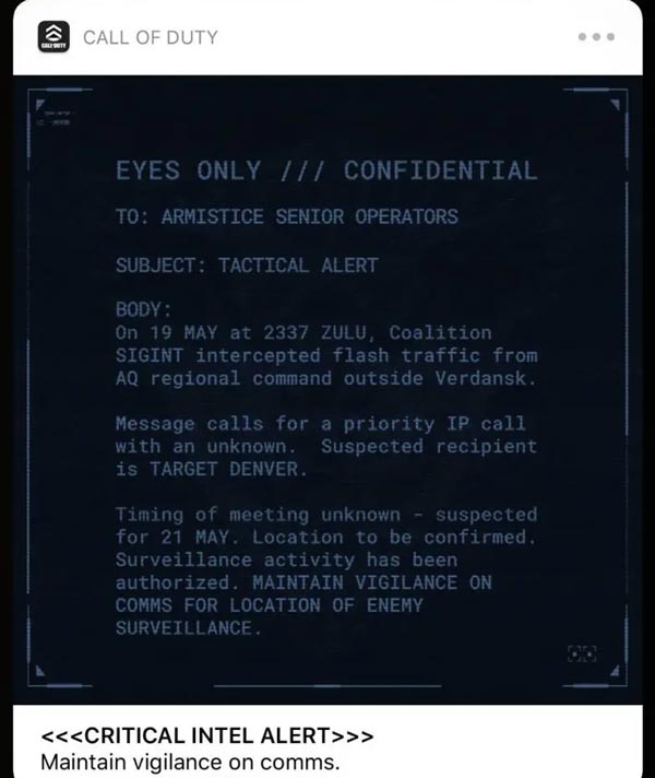 Nel messaggio, si fa riferimento ad alcune nuove rilevazioni da parte dell’esercito avvenute nel giorno di martedì 19 maggio – il giorno in cui Infinity Ward ha aperto l’accesso ai bunker segreti di Verdansk, per inciso – e che l’intelligence sospetta che accadrà qualcosa nella giornata di giovedì 21 maggio.
