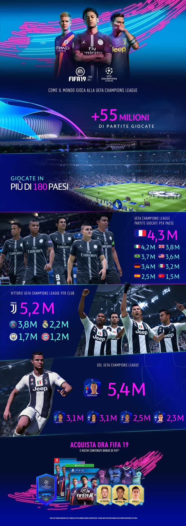Le edizioni Champions e Ultimate su PlayStation 4, Xbox One e PC offrono ulteriori contenuti rispetto all’edizione base: pacchetti Jumbo Premium FUT, Neymar e Cristiano Ronaldo in prestito per un determinato numero di partite e una speciale edizione dei kit FUT disegnati dagli artisti che hanno firmato la colonna sonora del gioco. Con più di 55 milioni di partite di UEFA Champions League giocate in oltre 180 Paesi, gli appassionati hanno potuto prendere parte a questo torneo giocando centinaia di partite.