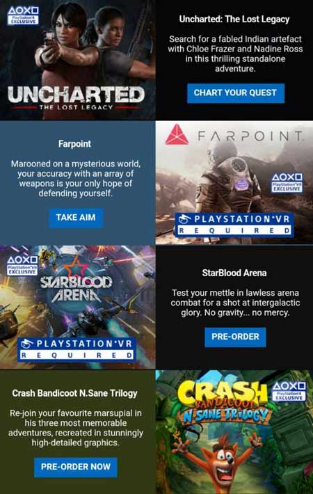 Su NeoGAF oggi è apparsa un’immagine che potrebbe fare definitivamente luce sul mistero. Sony ha infatti inviato alcune email promozionali ai suoi utenti, dove vengono elencate le migliori esclusive PlayStation 4 in uscita nei prossimi mesi. Insieme a Starblood Arena (qui un assaggio della recensione), Farpoint e Uncharted: L’eredità perduta (proprio oggi c’è stato l’annuncio della sua data di uscita), appare proprio Crash Bandicoot: N. Sane Trilogy.