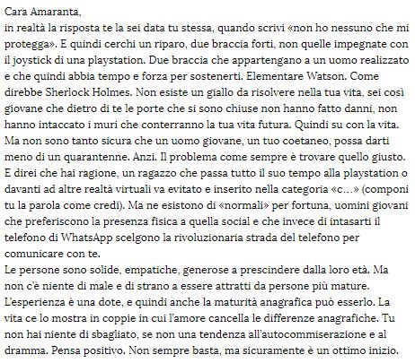 “[…] Il problema come sempre è trovare quello giusto. E direi che hai ragione, un ragazzo che passa tutto il suo tempo alla playstation o davanti ad altre realtà virtuali va evitato e inserito nella categoria «c…» (componi tu la parola come credi). Ma ne esistono di «normali» per fortuna, uomini giovani che preferiscono la presenza fisica a quella social e che invece di intasarti il telefono di WhatsApp scelgono la rivoluzionaria strada del telefono per comunicare con te. […]”