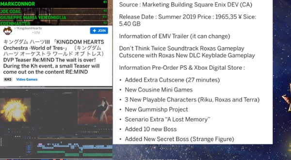 La foto sarebbe stata scattata da un addetto della divisione marketing e riporterebbe il primo screenshot del DLC Re:MIND, che mostra un nuovo personaggio giocabile che potrebbe essere Roxas. In effetti, le altre informazioni leakate parlano proprio di alcuni nuovi personaggi giocabili, e di ben 10 inediti boss.