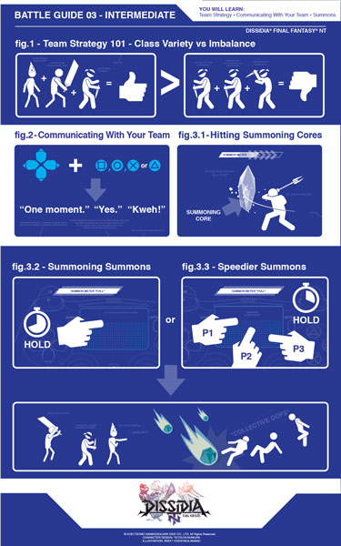I nuovi tutorial di battaglia spiegano in dettaglio le opzioni strategiche che saranno disponibili in questo fantastico picchiaduro a squadre 3 vs 3 che include più di 20 eroi e cattivi leggendari della serie di FINAL FANTASY. I tutorial spiegano scherzosamente il sistema di audacia, le possibili combinazioni delle varie classi di personaggi e molto altro ancora, offrendo ai fan tutto il necessario per diventare dei veri esperti di DISSIDIA FINAL FANTASY NT non appena il gioco uscirà all’inizio del prossimo anno.