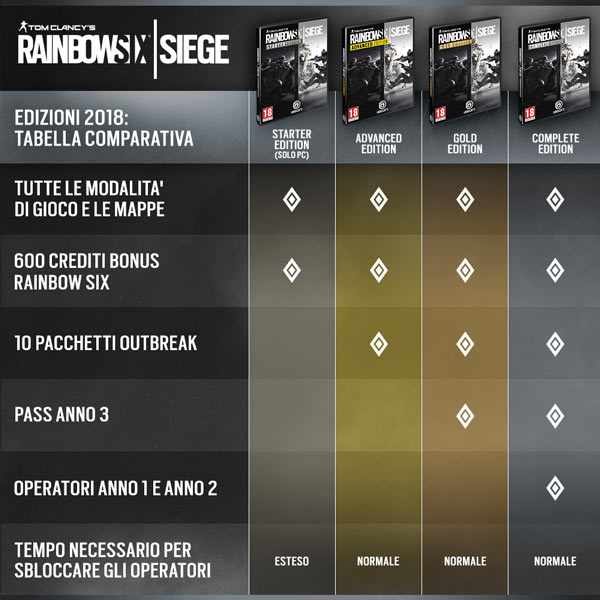 Ubisoft ha annunciato tre nuove versioni di Rainbow Six Siege che supporteranno l’uscita dei nuovi contenuti per l’Anno 3: Advanced Edition, Gold Edition e Complete Edition. Le tre edizioni saranno disponibili dal 13 febbraio 2018, mentre è già disponibile una Starter Edition.