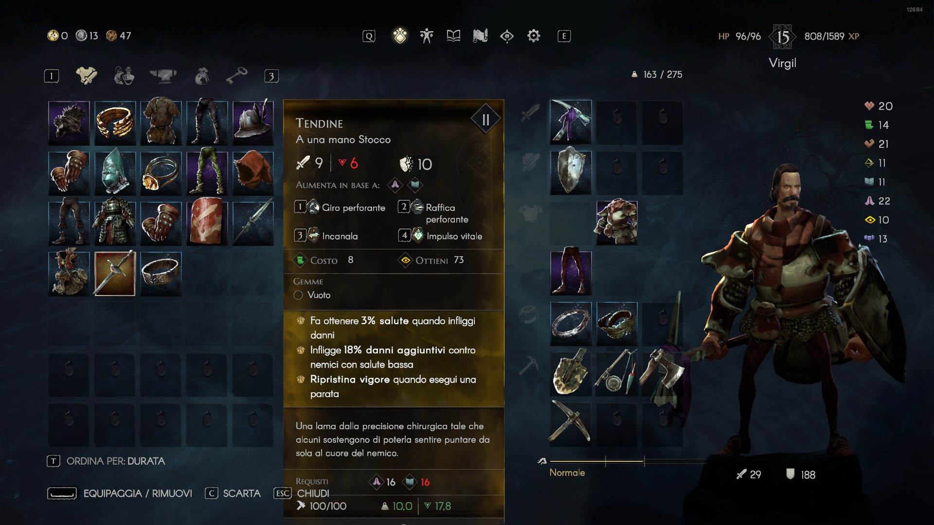 Grazie alla combinazione di tutti questi sistemi è già presente una notevole varietà di build e strategie per diversificare il nostro guerriero (o perché no, mago, ladro o chierico), utilizzando armi dalle movenze uniche e abilità personalizzabili tramite l’utilizzo di rune, gemme e incantamenti. L’equipaggiamento gioca un ruolo fondamentale e si rifà allo stile dei looter-slasher, con 4 livelli di rarità per armi e armature in grado di conferire bonus (ma anche malus) alle statistiche del personaggio.