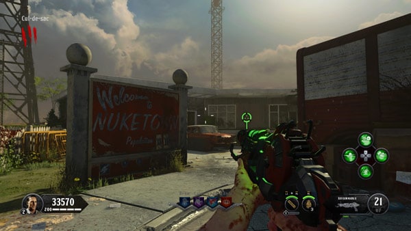 A sorpresa, su Black Ops II arrivò anche un’ulteriore interazione di Nuketown, questa volta con un design inedito e ripensata per la modalità Zombies. Una mappa estremamente classica nelle dinamiche – niente easter egg, nessuna missione da completare, solo sopravvivenza vecchio stile – il cui stile e colori vennero ripensati per adattarsi ovviamente al contesto più horror e cupo dei non-morti che invadevano il sito nel quale la bomba atomica era già esplosa, a differenza della mappa multiplayer – il perché ci è stato spiegato solamente in Black Ops 4 Zombies su Alpha Omega.