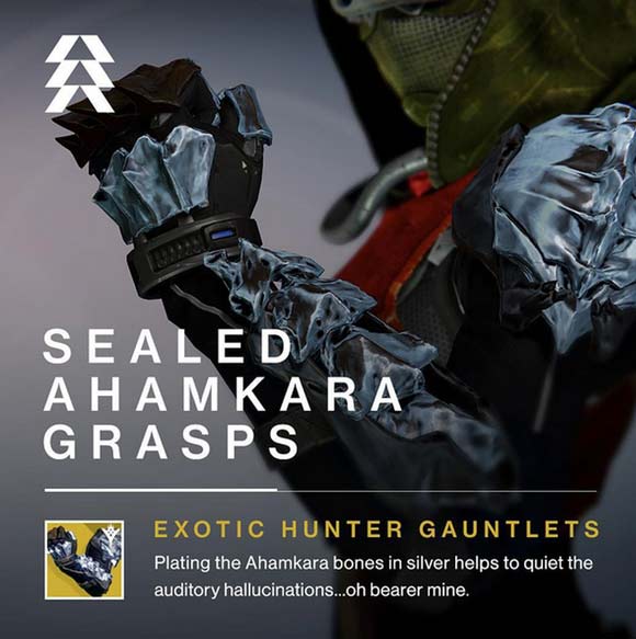 • Guanti per Cacciatore chiamati “Sealed Ahamkara Grasps”, il danno da mischia potrà ricaricare l’arma primaria e forniranno un carica in più per l’abilità corpo a corpo.
