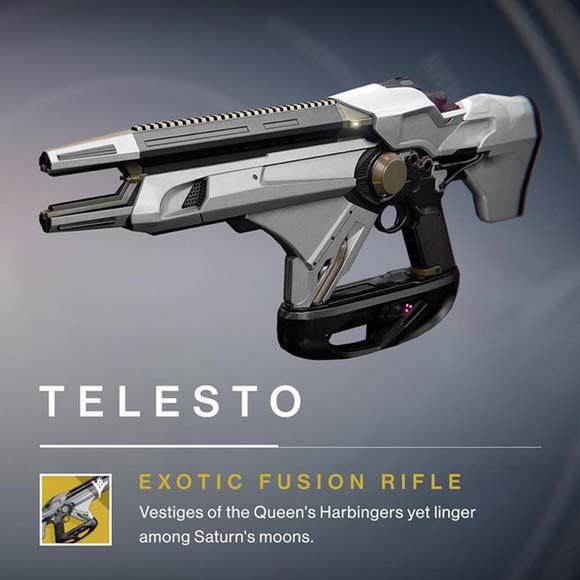 - Un Fucile a fusione “Telesto”, con quest’arma i proiettili si attaccheranno ai nemici ed esploderanno infliggendo danno da Vuoto. Inoltre le multi-uccisioni genereranno delle sfere di luce per gli alleati.