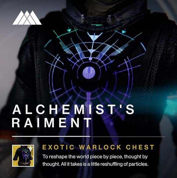 • Una Armatura per Stregoni chiamata “Alchemist’s Raiment”con questo equipaggiamento le sfere di Luce raccolte mentre la Super Caricata è utilizzabile, ricaricheranno le granate e l’abilità corpo a corpo. Inoltre raccogliere munizioni per l’arma principale garantirà la possibilità di ottenere Glimmer.