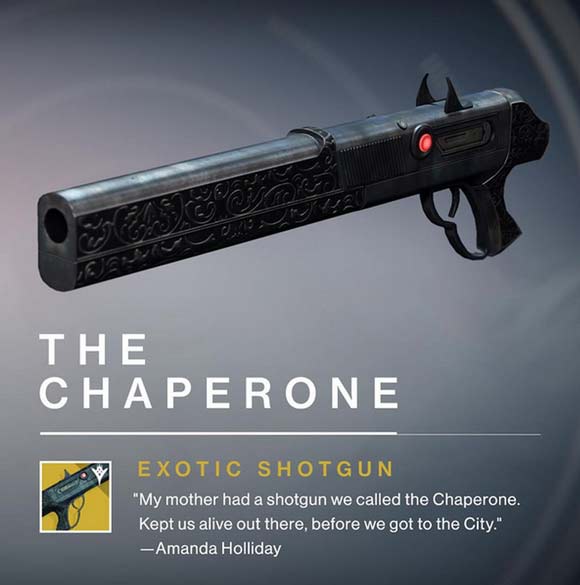 • Un Fucile a pompa chiamato “The Chaperone”, che garantirà un boost all’agilità se sarà equipaggiato. Inoltre le uccisioni di precisione aumenteranno per un breve periodo le statistiche dell’arma.