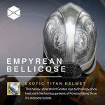 - Un Elmo per Titani chiamato “Empyrean Bellicose”, che permetterà di restare fermi per un breve periodo di tempo, in aria, mentre si mirerà. Se si avrà la Super Caricata pronta, le sfere di Luce raccolte ricaricheranno l’abilità melee.