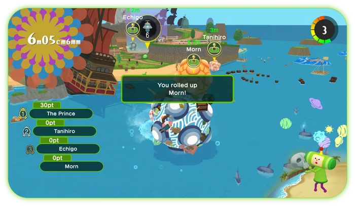 La struttura delle missioni alterna livelli della campagna principale, che proseguono la narrazione surreale con obiettivi che mirano a ricostruire il cosmo, e una serie di sfide secondarie più focalizzate che trasformano alcune aree in piccoli puzzle spaziali a tempo. La sensazione generale è che la campagna sia accessibile e relativamente lineare per chi vuole solo vivere la storia, mentre il vero valore di rigiocabilità arriva dalle sfide, dagli obiettivi e dalla modalità multiplayer. KatamariBall è la sorpresa migliore in questo senso: la trasposizione della filosofia di raccolta in una modalità competitiva fino a quattro giocatori funziona sorprendentemente bene, regalando sessioni in cui controllo della palla, lettura del terreno e tempismo determinano vittorie e capovolgimenti improvvisi. È una modalità che si presta sia a partite rapide fra amici sia a competizioni più lunghe online e che valorizza l’anima sociale del brand trasformando il semplice rotolare in uno sport di caos organizzato.