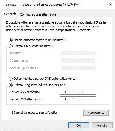 - In “Server DNS alternativo” inserite 1.0.0.1