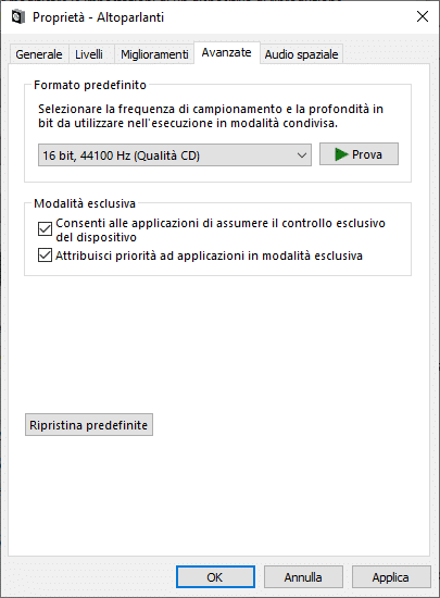 - Dal menù andate in “Avanzate” e in “Formato predefinito” selezionate “16 bit, 44100 Hz (qualità CD)“. Se non trovate questa opzione, scegliete quella più in alto tra quelle disponibili.