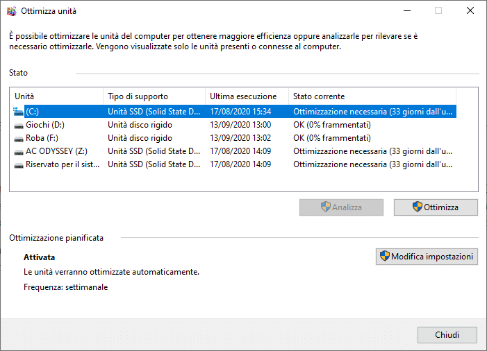Anche questa è un’opzione poco utilizzata, ma estremamente utile ed efficace. Se hai installato Windows 10 da tempo e non hai ancora mai deframmentato il tuo sistema, questa operazione potrebbe dare una grande mano in termini prestazionali. La deframmentazione consiste semplicemente nella riorganizzazione dei file di sistema, così che il computer possa accedervi più velocemente. Prima di seguire questo semplice procedimento, assicuratevi di non dover utilizzare il PC per fare altro, poiché potrebbe impiegarci diverso tempo. Ecco gli step: