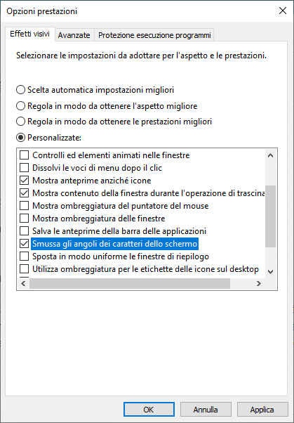 In questo modo, si manterranno gli effetti visivi principali (necessari per mantenere un livello minimo di estetica), ma saranno disabilitati tutti quei fenomeni che vanno a peggiorare le prestazioni del sistema. Sentitevi liberi di selezionare l’opzione “Regola in modo da ottenere le prestazioni migliori”, la quale disabiliterà tutti gli effetti grafici ma porterà al massimo livello di ottimizzazione.