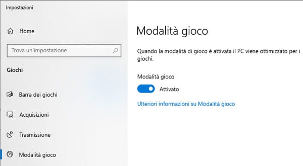 All’interno di Windows 10, è stata introdotta di default una modalità pensata espressamente per i videogiocatori. Per entrare nella Modalità gioco, basta scrivere nella barra di ricerca (in basso a sinistra) “Attiva Modalità gioco”, e selezionare il risultato. Vi ritroverete davanti a questa schermata; a questo punto attivate la modalità e il gioco sarà fatto.
