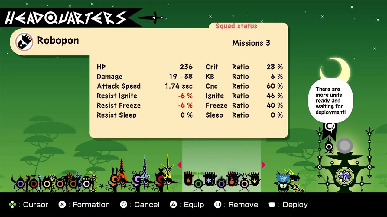 Dopo aver completato una missione (risolvibile in pochi minuti e capace di variare da semplice prosecuzione ad uno scontro con una possente creatura nemica), Patapon trasporta il giocatore all’interno dell’accampamento, dando modo di migliorare e personalizzare le varie truppe, che differiscono a seconda del ruolo e della capacità offensiva e difensiva. Inutile dire che la componente strategica qui riveste un ruolo centrale, in quanto risulta necessario ponderare per bene chi portare sul campo di battaglia (classi con attacchi a distanza, piuttosto che da combattimento ravvicinato, oppure optando per uno stile maggiormente difensivo con scudo e spada).
