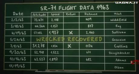 MOTIVAZIONE PERIODO: Nella stanza Bellica della campagna, vi è un SR-71 (Blackbird) in una tabella che registra alcuni dati riportanti i vari piloti , e vi è una data sulla schedariportante l’ultimo volo, ossia 16/10/63. Essendo John F. Kennedy deceduto il 22 novembre 1963, intuiamo che si svolga in quel periodo.