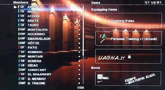 Nella Master League quest’anno, c’è un nuovo menù, chiamato “articoli”, che in pratica consiste nell’ “elenco oggetto del negozio e macchinari”. Nel negozio stesso si ha accesso a 18 diversi stati per aumentare le capacità dei giocatori come: l’allenamento per migliorare la forza con i manubri, alla bicicletta che aiuta a migliorare la resistenza. Ogni elemento che acquistate dunque, ricordate che può essere assegnato solo ad un giocatore! fate attenzione! Alcuni elementi o oggetti che comprate, possono durare solo per un certo periodo di tempo; come ad esempio solo per una stagione. Inoltre ogni giocatore, sembra avere una specie di menù personale dotato di 3 slot, più una di avvio. In pratica, sono come 3 diverse specialità che possono acquisire nel tempo. Ad esse si possono anche abbinare le scarpe, ovviamente se mettete come specialità la “velocità” ad un giocatore, sarà inutile abbinargli una scarpa che ha come caratteristica la potenza.