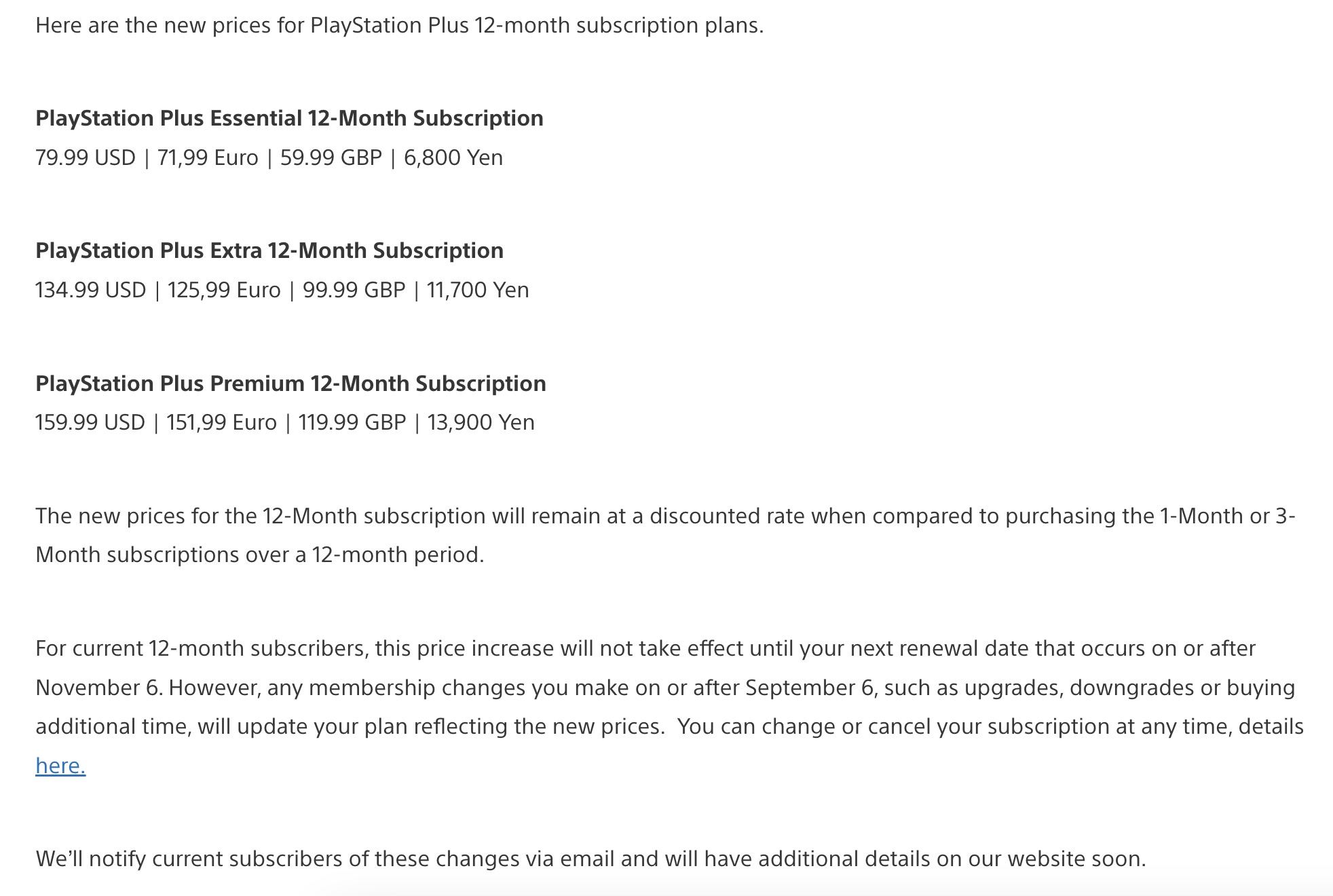 Oltre a questo, la casa nipponica ha tenuto a precisare che tutti coloro che avranno al momento l’abbonamento attivo, non subiranno alcun costo aggiuntivo fino al momento del rinnovo. Naturalmente arriveranno a brevissimo le dovute comunicazioni mezzo mail a tutti i giocatori, così come un aggiornamento direttamente sul PS Blog.