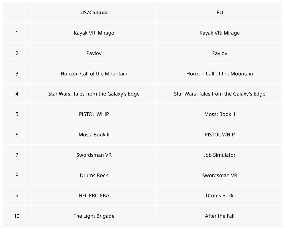 Come si denota facilmente, al primo posto non vi è Horizon: Call of the Mountain, bensì Kayak VR: Mirage, gioco in cui gli utenti sono chiamati a manovrare fisicamente il kayak per vincere le regate, oppure per godersi in totale relax il paradisiaco paesaggio circostante.