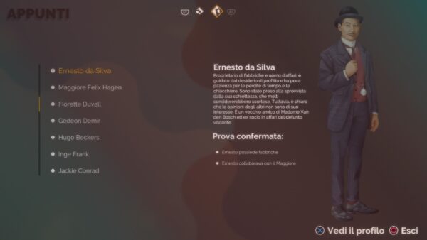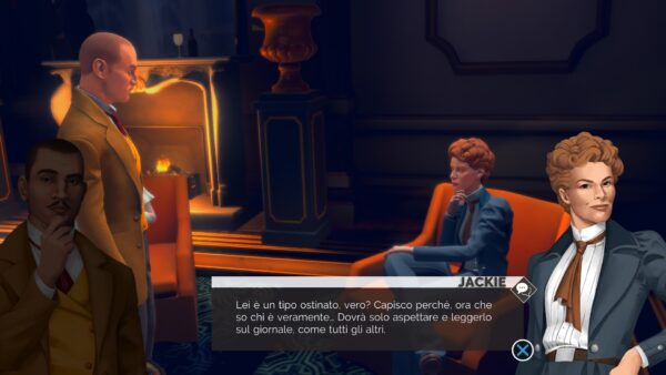 Il giocatore, assumendo il punto di vista del giovane e perspicace detective, avrà quindi il compito di osservare gli eventi e svelare i segreti di tutti i personaggi in scena: abbiamo la giovane Angeline e l’altera madre Cassandra, il futuro marito Gedeon, una giornalista, un ex soldato con disturbo post-traumatico, un Maggiore alquanto ambizioso, diversi domestici e membri dello staff della casa… insomma, chi più ne ha più ne metta.