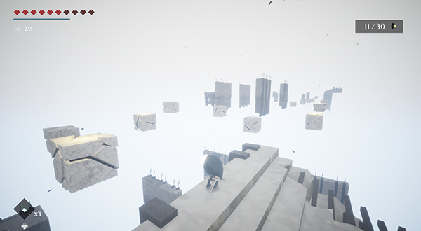 Si entra in un Vuoto attraverso diverse statue disseminate nel mondo di gioco. Una volta teletrasportati nella nuova area, ci troveremo davanti a una sfida platform dove dovremo raggiungere l’uscita dell’area raccogliendo, nel frattempo, delle sfere luminose. Tra piattaforme semoventi, balzi vertiginosi, corse sulle pareti e quant’altro, completare il Vuoto potrebbe richiedere anche un’oretta buona di tentativi: badate bene, ogni volta che si cade si deve ricominciare da capo, senza alcun checkpoint lungo la via. Questa meccanica porta necessariamente ad affrontare lunghe sezioni trial & error, dove a volte si comprende il da farsi ma non si riesce a metterlo in pratica in quanto sono richiesti riflessi perfetti e una precisione millimetrica. La telecamera, i colori piatti e la profondità di campo sono nemici terribili, che spesso provocano frustrazione (il personaggio sembra riuscire ad appendersi a una sporgenza ma all’ultimo ci si accorge di essere troppo lontani. Oppure, lo scatto da fare è chiaro, ma una telecamera decisamente scomoda impedisce di prendere bene la mira). I Vuoti hanno diversi livelli di difficoltà, ma non seguono una progressione: potremmo incontrare una sfida facile e a pochi minuti di distanza un Vuoto decisamente più difficile e complesso.