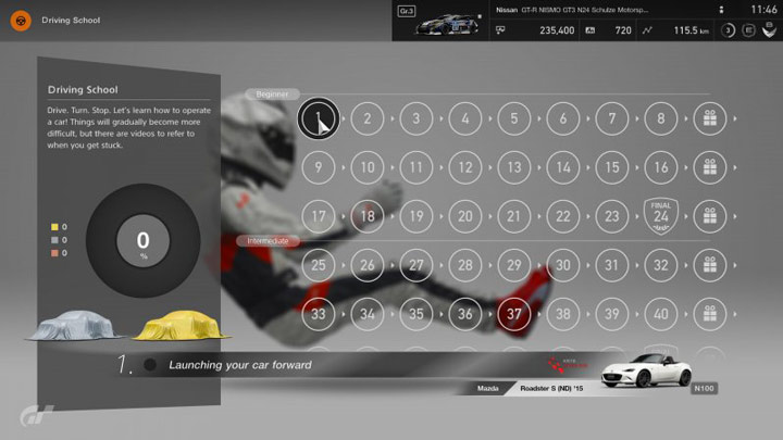L’ Accademia di Guida sostituisce le vecchie patenti, facendovi affrontare 48 diverse lezioni a bordo di altrettante differenti vetture. In Sfida Missioni invece potrete affrontare 64 sfide che vanno da gare complete e eventi monomarca, su sterrato, endurance su 15 o 30 giri con l’eventuale consumo di gomme e benzina. Nell’Esperienza sul Circuito infine si potrà imparare a padroneggiare il tracciato sfruttando i cordoli e le traiettorie più congeniali, con sezioni specifiche oppure giri completi. Questi, in sordina, sono i contenuti che saranno disponibili nel single player. Servono molto per imparare a “stare in pista” ma durano molto poco, rispetto ai precedenti GT. Saranno inoltre molto utili per salire livello, poiché la progressione personale del giocatore è affidata a crediti, punti miglia accumulati ed esperienza maturata in pista.