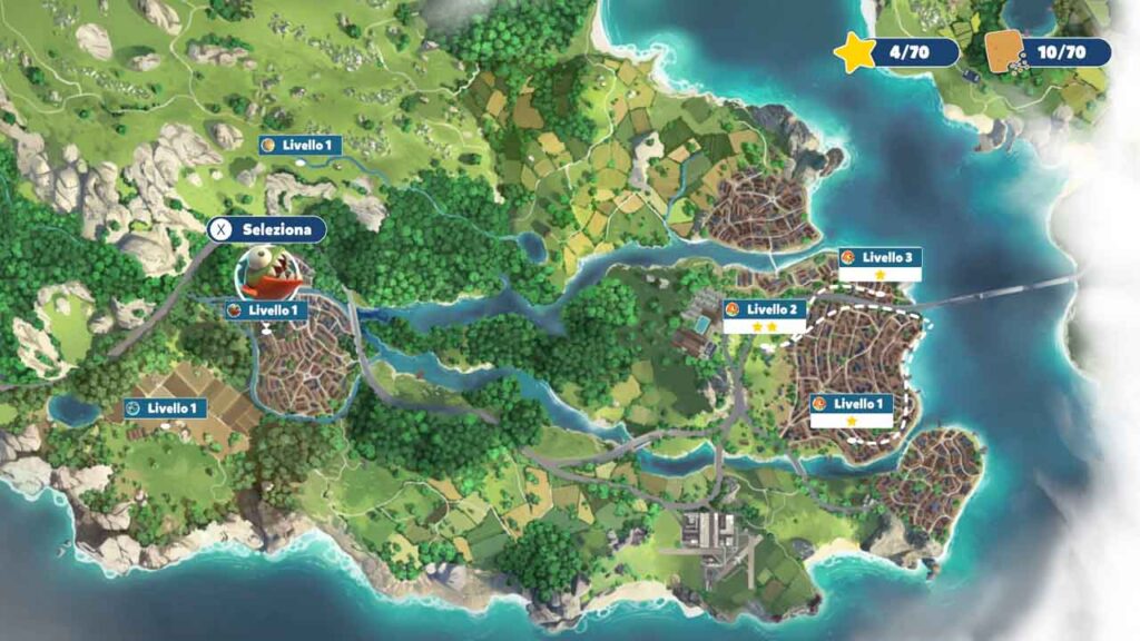 Ogni pesce ha tre livelli da completare, e all’interno di ciascun livello troviamo 5 pezzi di pane da trovare e collezionare. Sono presenti diversi checkpoint, che rendono l’esperienza meno sgradevole di quello che potrebbe essere. Nel momento in cui si seleziona un livello, vengono mostrati degli indizi per trovare i pezzi di pane, ma una volta in partita questi non sono più disponibili. Ciò risulta scomodo se si cerca di completare il livello al 100%, poiché bisogna trovarli “a caso” oppure ci si deve segnare prima gli indizi su un pezzo di carta.