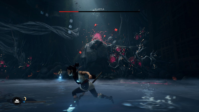 Bridge of Spirits ha un focus principale sull’esplorazione e sulla risoluzione dei suoi enigmi ambientali, sempre ben congeniati e in larga parte caratterizzati da quella che è la minaccia principale del gioco, quelle malefiche piante rosse che hanno invaso la foresta e che sembrano richiamare spiriti malvagi nel mondo e stanno corrompendo intere aree del mondo di Kena. Ed è qui che entra in gioco la componente più action dell’esperienza. Kena, insieme al suo fidato bastone da combattimento che utilizza come strumento durante l’esplorazione e come arma durante i combattimenti, è capace di muoversi e scivolare soavemente di qua e di là, sfuggendo agli attacchi nemici e scegliendo il momento giusto per attaccare o parare un colpo, cosa che può dare un notevole vantaggio poiché soprattutto i boss resteranno interdetti da questa rapidità nel contraccolpo di Kena.