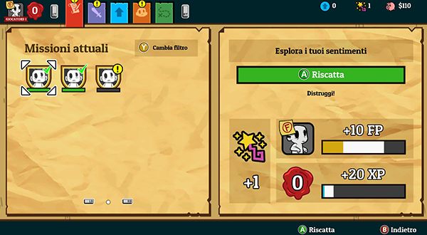 Oltre ad esplorare la mappa di gioco in cerca di nuove missioni e di “dungeon” alla nostra portata, Nobody Saves the World offre delle quest specifiche per ogni singolo Aspetto (colpisci tot nemici con quella determinata mossa, recupera Mana grazie a quella abilità, ecc). Completare queste missioni consentirà sia di aumentare il livello del nostro protagonista, sia di far salire di classe le nostre differenti forme (si parte dalla F fino alla S), così da sbloccarne di nuove attraverso l’albero dedicato.