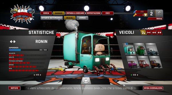 Attualmente CARRUMBLE comprende 8 veicoli diversi, anche se, inizialmente, possiamo sceglierne soltanto 1 su 3. Ogni veicolo potrà essere acquistato anche con la valuta classica del gioco (la benzina) che otterremo ad ogni partita completata. Per fortuna il farming non è per niente eccessivo, anzi, ci basteranno soltanto un paio di partite per sbloccare nuovi veicoli da utilizzare. D’altro canto, però, le skin richiedono più tempo per essere sbloccate, visto che il prezzo minimo per le skin più “basilari” si aggira intorno ai 500.