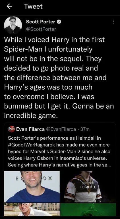 “Sebbene abbia doppiato Harry nel primo Spider-Man, purtroppo non sarò presente nel sequel. Hanno deciso di seguire la strada del fotorealismo e la differenza di età tra me ed Harry è troppo grande. Mi dispiace molto, ma lo capisco. Sarà comunque un gioco incredibile.”