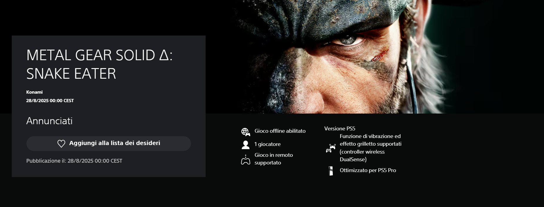 Il 2025 si preannuncia un anno straordinario per i videogiochi, con tantissimi titoli attesi dai fan. Tra questi spicca Metal Gear Solid Delta: Snake Eater, il remake dell’amatissimo capitolo targato Konami. Fino a oggi la data di uscita ufficiale era avvolta nel mistero, ma un possibile errore di Sony potrebbe averla rivelata in anticipo.