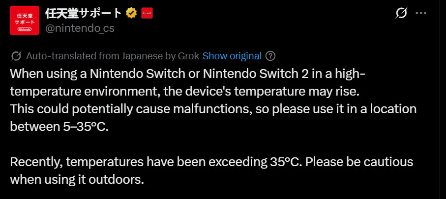 In Giappone, dove le temperature estive hanno recentemente superato i 35 °C, Nintendo invita i giocatori alla massima prudenza, soprattutto durante l’uso all’aperto. È inoltre sconsigliato lasciare la console in luoghi chiusi e caldi, come all’interno di un’auto, per evitare danni interni legati al calore.