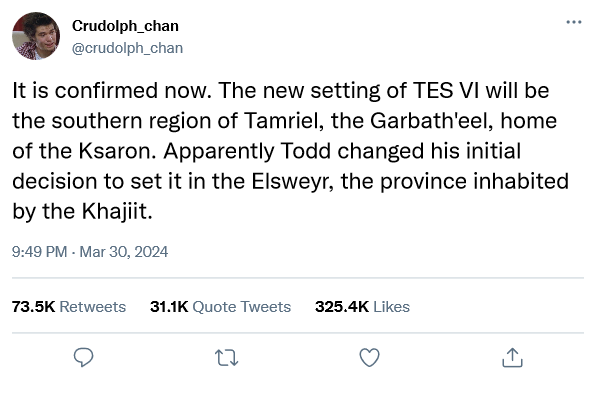 Per il momento, ecco tutto ciò che sappiamo finora su Elder Scrolls VI, e in attesa di ulteriori aggiornamenti non ci resta che affidarci alle parole di Crudolph_chan.