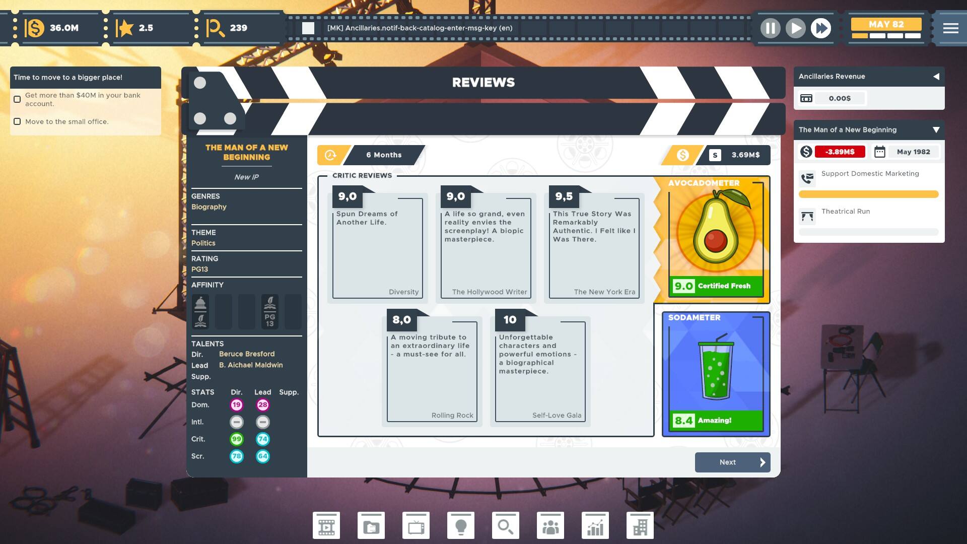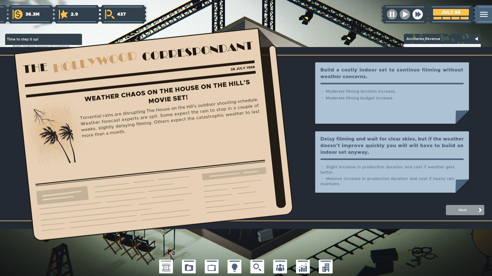 Uno degli aspetti più interessanti del gioco è la sua capacità di simulare l’evoluzione del settore cinematografico attraverso eventi e cambiamenti storici. Tuttavia, questi elementi risultano troppo rari, e la gestione dello studio si riduce spesso a un ciclo di produzione, pubblicazione e analisi dei film, con poche vere sorprese. L’introduzione di imprevisti e controversie, come scandali legati agli attori, fallimenti al botteghino o persino la possibilità di affrontare la pirateria e le crisi economiche, potrebbe rendere il gameplay meno lineare e più avvincente. Attualmente, l’assenza di queste dinamiche rende la gestione prevedibile e, alla lunga, ripetitiva.