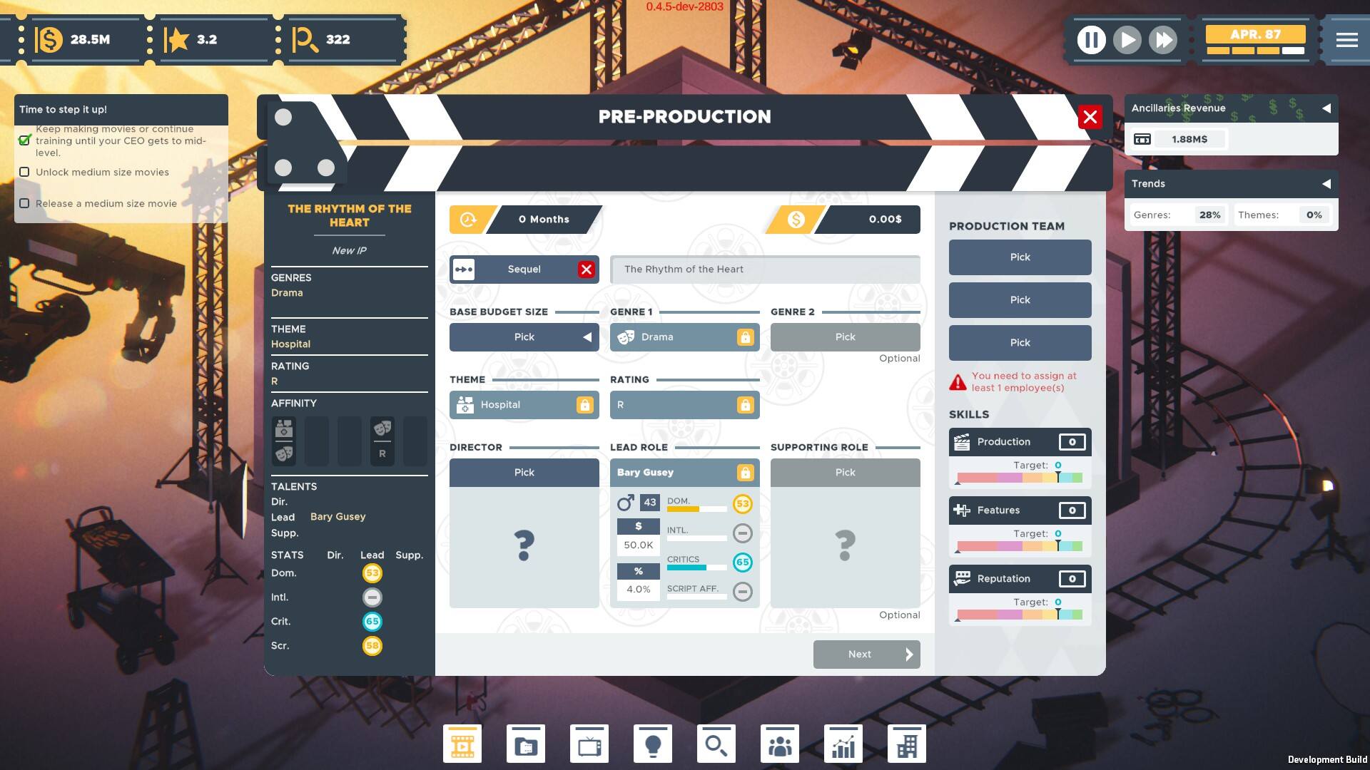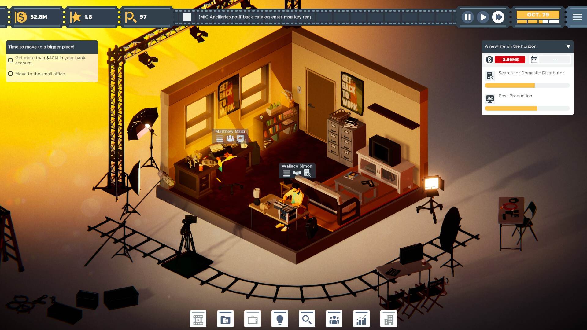 Il gameplay di The Executive – Movie Industry Tycoon è intuitivo ma ricco di profondità strategica. Se gestire uno studio cinematografico può sembrare semplice all’inizio, la realtà è ben diversa: ogni decisione finanziaria e creativa ha un impatto diretto sul successo o sul fallimento dell’azienda. Un’errata gestione delle risorse, una scelta sbagliata di mercato o investimenti poco oculati possono condurre rapidamente alla bancarotta.