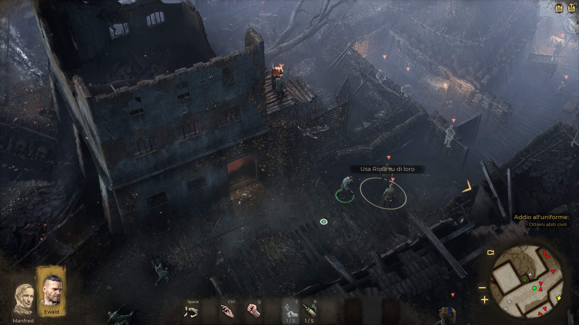 Il gameplay di War Mongrels offre una sfida strategica intensa e furtiva, ideale per chi ama i giochi di tattica in tempo reale. Sin dalle prime fasi, il gioco richiede precisione e sangue freddo. Dopo un breve tutorial che introduce i comandi base e le tecniche essenziali per muovere e gestire più personaggi, i giocatori vengono subito catapultati in azione, costretti a muoversi tra le trincee mentre le forze nemiche attaccano. Manfred ed Ewald, i protagonisti, imparano rapidamente a difendersi: Ewald sfrutta la propria forza per eliminare i nemici a mani nude, mentre Manfred usa il suo coltello per colpire in modo letale e silenzioso.