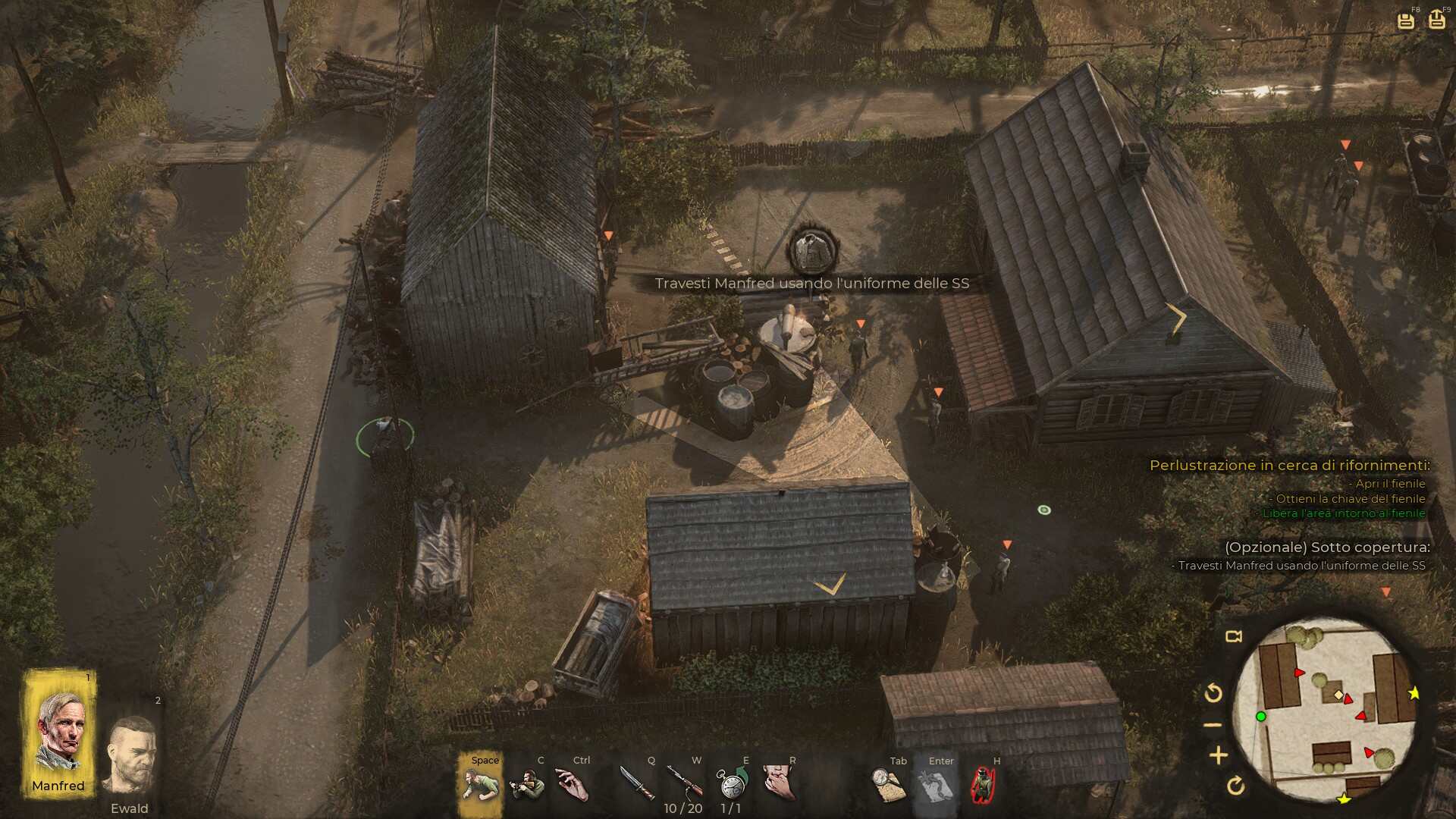 Ogni missione si svolge su mappe ampie e ricche di dettagli, costellate di nemici che non sospettano della nostra presenza. Qui, la furtività è la chiave: è fondamentale nascondersi, sfruttare la copertura degli oggetti e monitorare i campi visivi dei nemici, rappresentati da coni che indicano sia zone di rilevamento immediato che aree in cui i giocatori possono passare inosservati solo strisciando. Manfred ed Ewald possono anche nascondere i corpi dei nemici eliminati per evitare che vengano scoperti e diano l’allarme.
