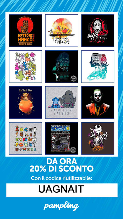 Se avete intenzione o avete già acquistato magliette o altro merchandise su Pampling, sappiate che qui di seguito potete usufruire del codice sconto “UAGNAIT” che vi offre il 20% di risparmio sul normale prezzo di vendita! Utilizzatelo durante i vostri acquisti quando vi verrà chiesto di inserirlo, e sappiate che il codice è riutilizzabile.